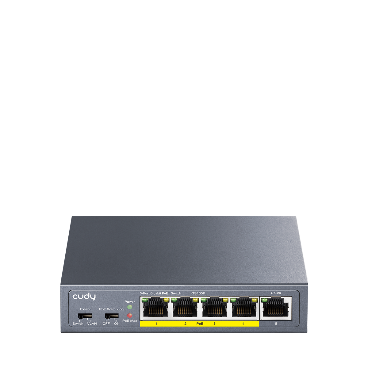 سويتش PoE مثبت على الجدران بقدرة 36 واط مع نظام تبريد صامت، ومزود بمفتاح تبديل الأوضاع Default/Extend/VLAN ومفتاح تشغيل/إيقاف خاصية المراقبة (Watchdog).