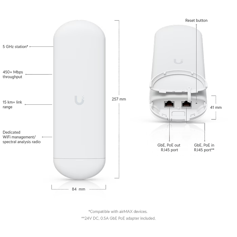 جهاز راديو WiFi مدعوم من UISP، مصمم لتطبيقات الربط نقطة إلى نقطة (Point-to-Point) وللاستخدام في مواقع العملاء (CPE).