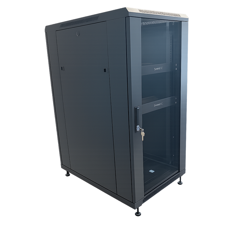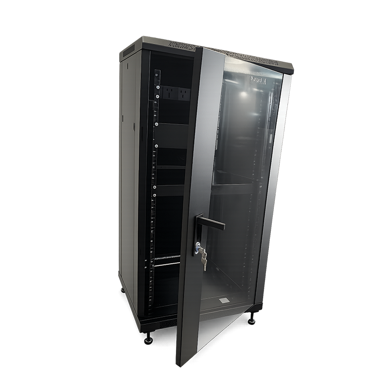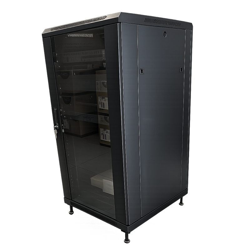 Its glass front door offers visibility of installed equipment while maintaining a clean and professional appearance. The cabinet is suitable for use in offices, server rooms, control rooms, and telecom environments.