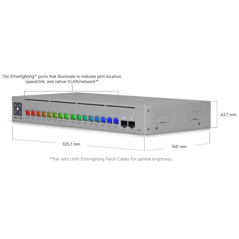 A 16-port, Layer 3 Etherlighting™ switch with 2.5 GbE, PoE++ output, and versatile mounting options.