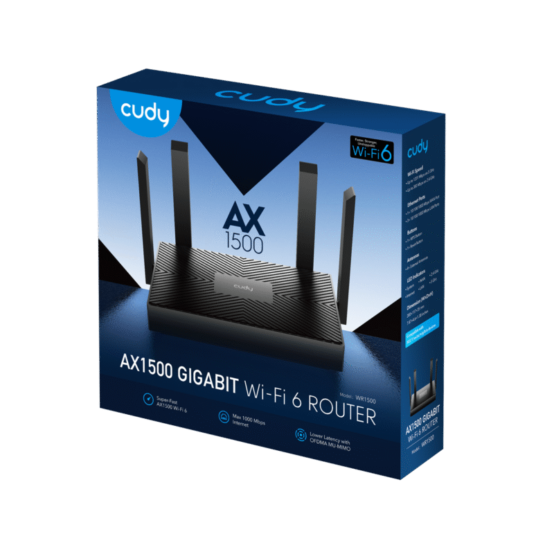 A Gigabit WiFi 6 router with 4 Gigabit ports, suitable for home internet up to 1000 Mbps, connecting many devices, and reducing latency.